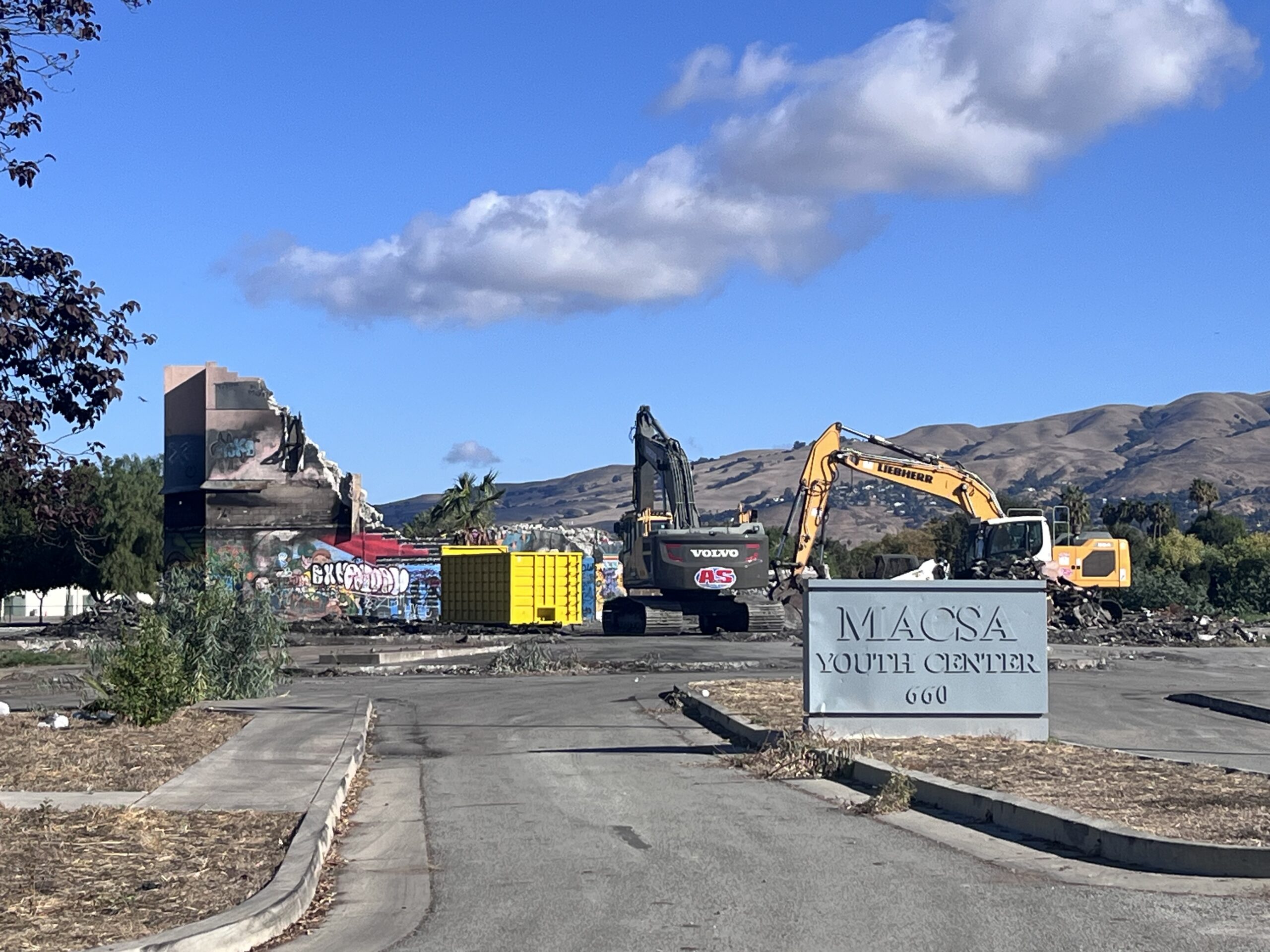 Excavators knocked down what remained of the Mexican American Community Services Agency (MACSA) building Saturday, breaking the hearts of community advocates who fought to save it. Trustees with the Alum Rock Union School District, which owns the property, previously approved demolishing the building in an emergency vote after the fire, pending a structural report on the damage. The cause of the fire, which happened in the early morning hours of Aug. 29, is still under investigation.