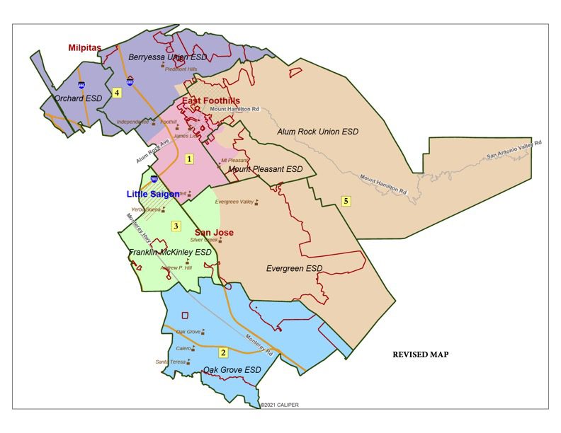 Although the majority of the East Side Union High School District lies within San Jose, it also includes parts of Milpitas. In creating the maps, the district contracted legal expert Justin Levitt. Levitt said federal guidelines require trustee areas to include about the same number of residents — with a maximum 10% difference between the largest and smallest districts. The district drew the maps blind to political data and where any of the incumbents lived.