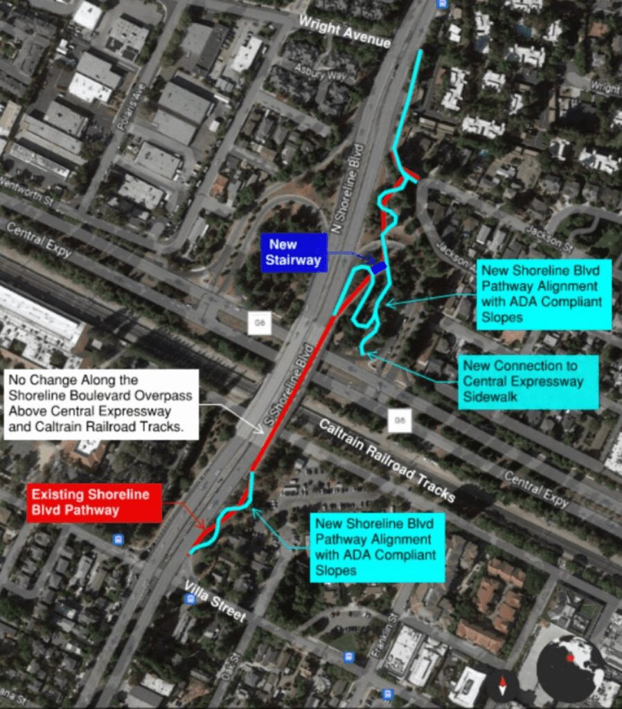 The initiative aims to enhance the experience for walkers and bikers traversing a section of Shoreline that crosses above Central Expressway and the Caltrain tracks, which acts as a major connector between downtown Mountain View and the northern portion of the city.
