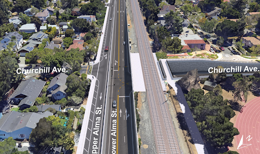 The partial underpass would depress the eastbound roadway under the tracks at Churchill and allow drivers to turn left or right onto Alma Street. A wall would separate the northbound and southbound lanes of Alma, and bicyclists and pedestrians would be able to cross through a tunnel at Seale Avenue, according to the most recent planning documents.