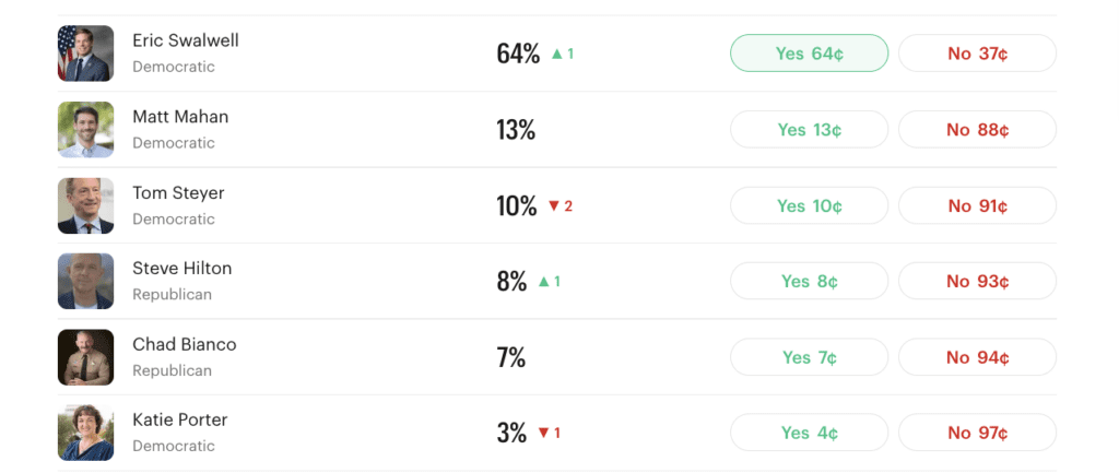 “Polls tell us where an election stands today, while betting markets tell you where those who place bets think the race will end up,” Spencer Kimball, director of polling at Emerson College, told San José Spotlight. “These bets can be based on the polls, finance and general name recognition. Another notable difference is that surveys are of voters living in the state, whereas anyone can place a bet on an election.”