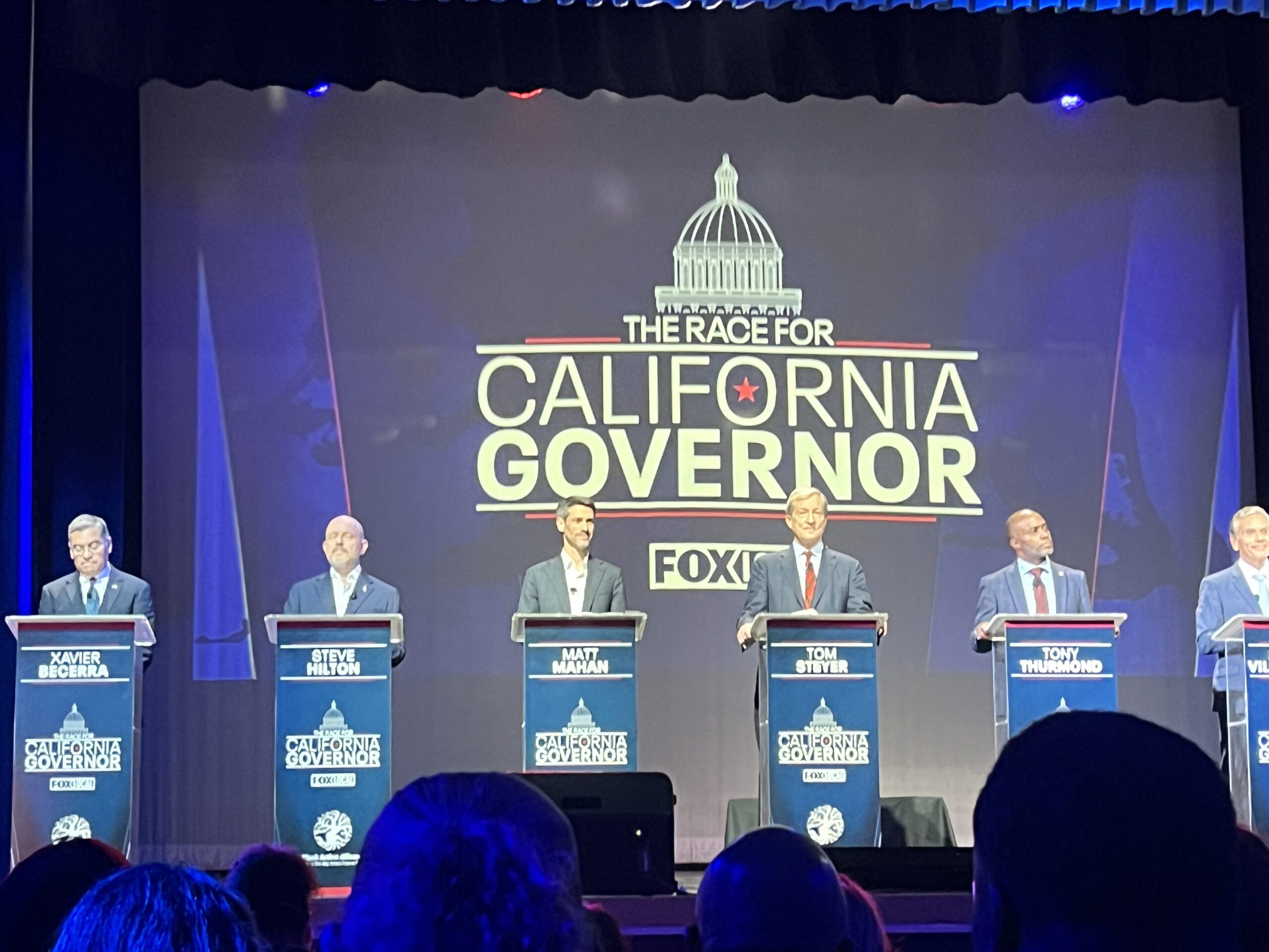 The debate, hosted in San Francisco by KTVU, had Mahan standing shoulder to shoulder with six other candidates — conservative TV news pundit Steve Hilton, billionaire Tom Steyer, former Attorney General Xavier Becerra, former Los Angeles Mayor Antonio Villaraigosa, State Superintendent Tony Thurmond and former State Controller Betty Yee. Several candidates traded barbs on topics including California’s cost of living, immigration, education, homelessness and contentious climate goals.
