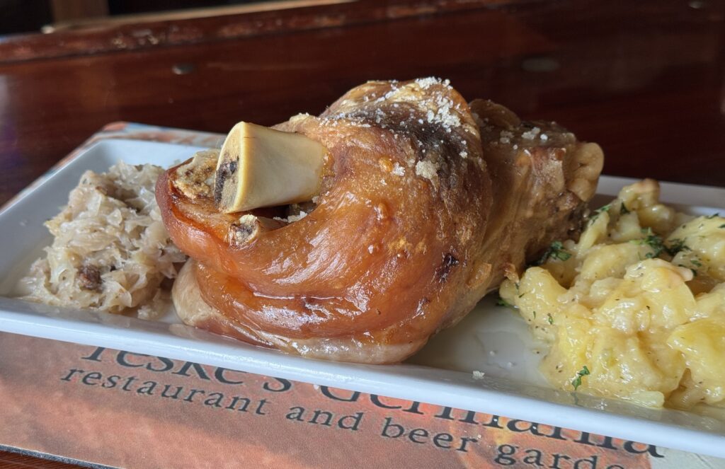 Served with a soft and mellow sauerkraut and a mound of potato salad with a vinegar-based dressing, it’s an elegant and filling presentation and Teske’s signature dish.