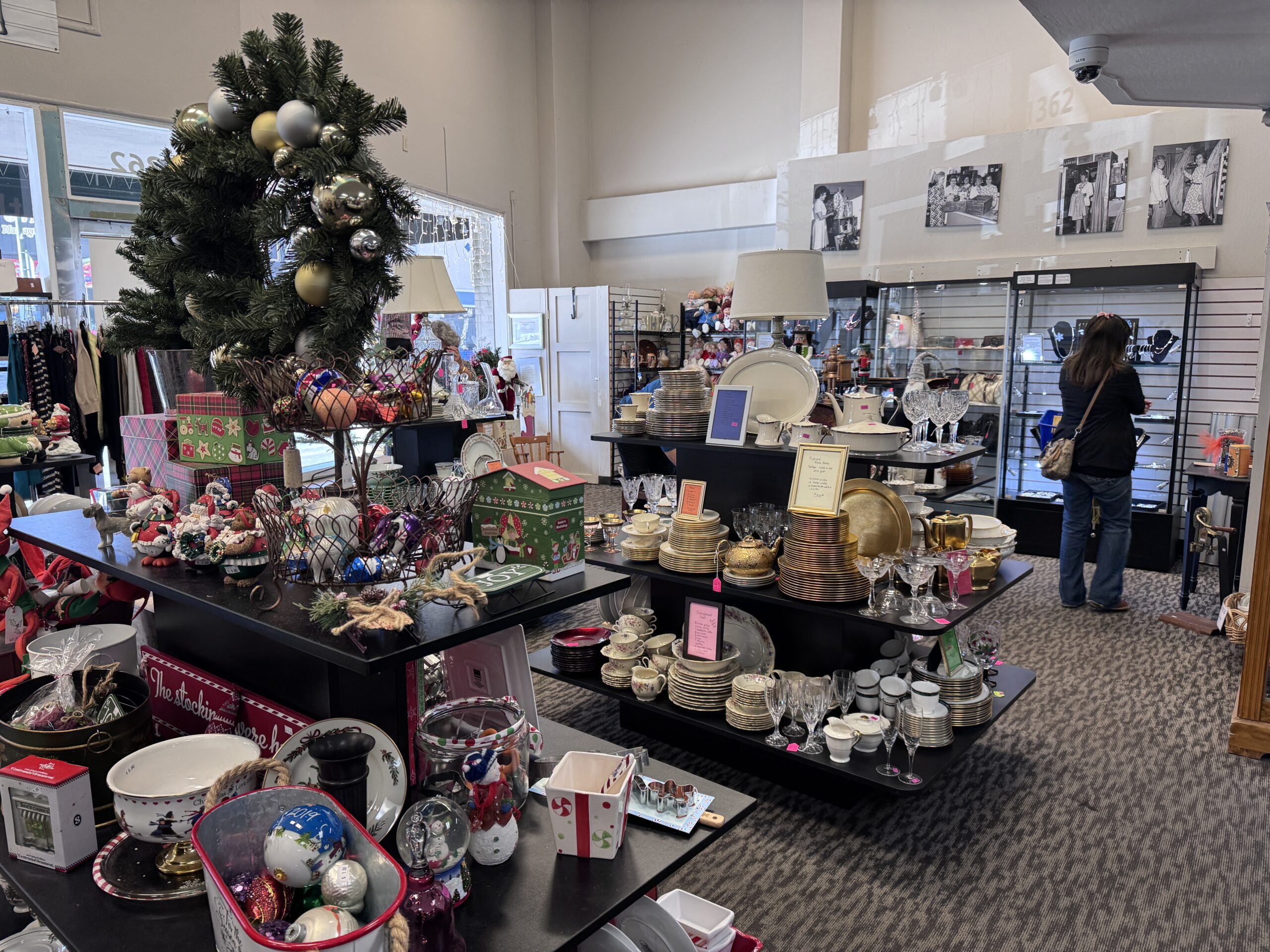 The quality is easily a notch above what anyone would expect for a thrift store. Cases display gold and silver jewelry and Waterford crystal. A nearby table holds what is left of a large collection of vintage nutcrackers. Harrigan points out a vintage Diane Von Furstenberg blouse while Duggins enthuses over a set of Haviland Limoges china.
